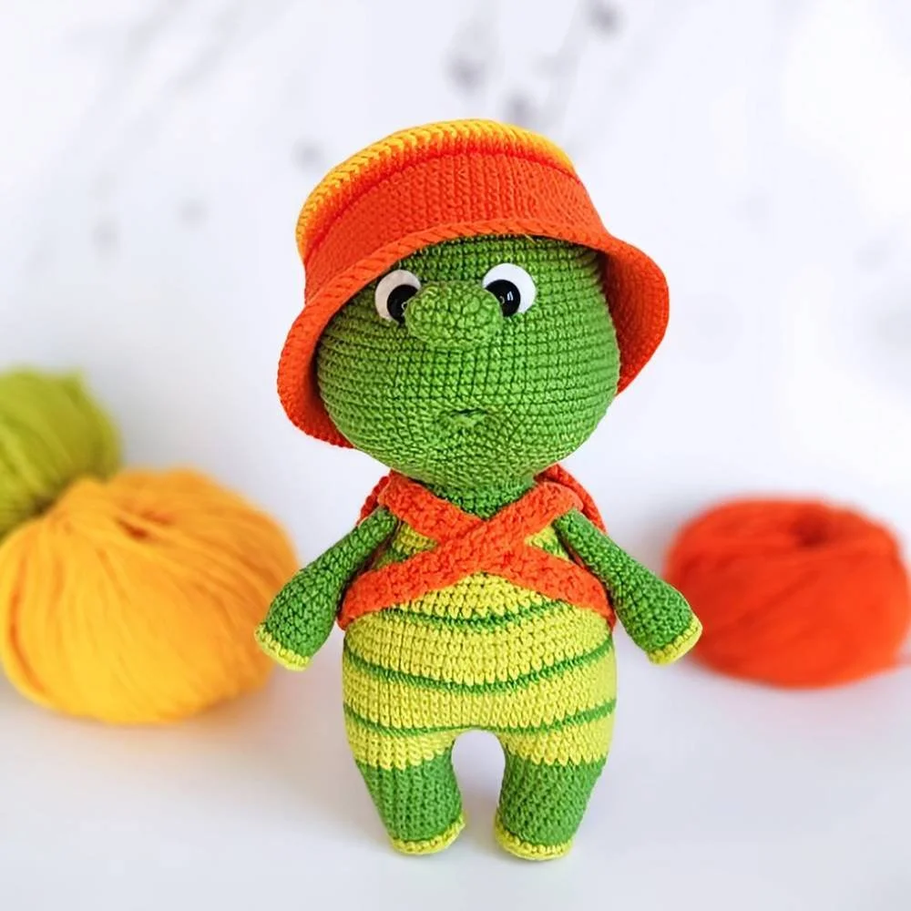 Noah is the type of amigurumi that seems to belong to both nature and imagination. His outfit, crocheted in one piece, blends cozy shades of blue, green, and beige, creating a timeless look that reminds you of childhood toys carefully kept in a wooden drawer. His little shirt and pants are worked directly into his body, giving a clean and seamless finish, while his round glasses and textured spikes add a playful touch that makes him unique. As you crochet him, you can almost picture him walking through a quiet garden, notebook in hand, taking notes about the wind and the colors of the trees.